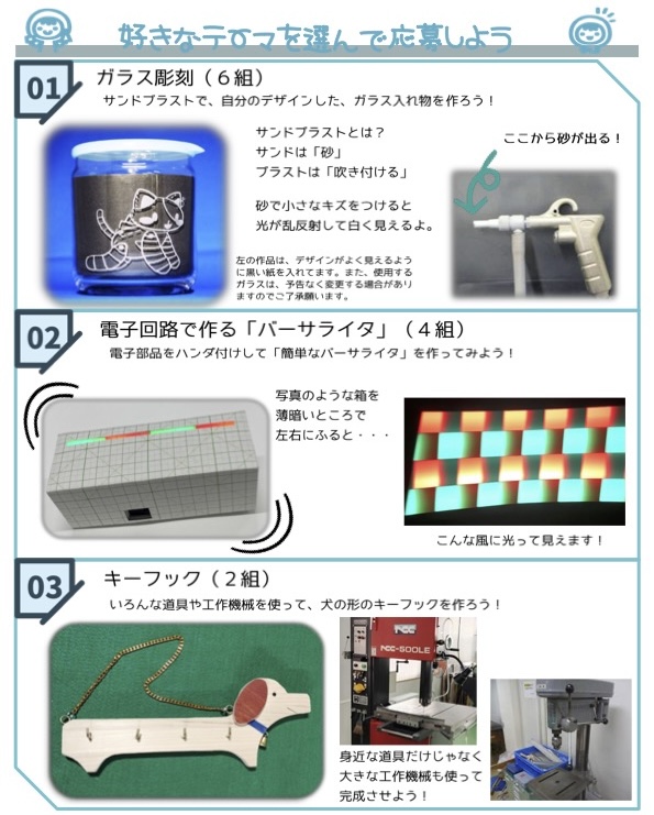 - ◯内容:ガラス彫刻(6組)、電子回路で作る「バーサライタ」(4組)、キーフック(2組)